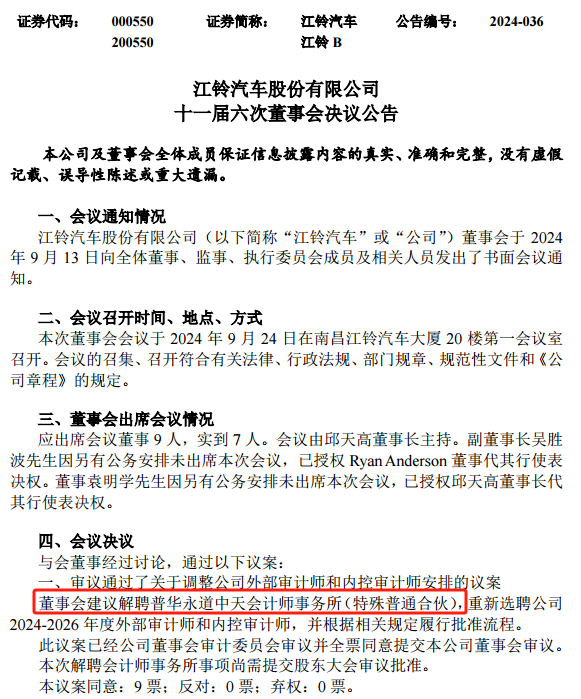 9月24日晚,江铃汽车宣布,公司股东大会建议解聘普华永道中天会计师事务所(特殊普通合伙)(以下简称普华永道),主要是因为普华永道最近受到监管处罚。