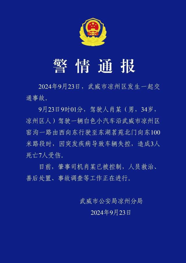 9 月 23 日 9 时 01 分,司机肖某(男,34) 岁,凉州区人)沿着武威市凉州区窑沟开着一辆白色小汽车,从西向东行驶到东湖茶苑北门。 100 米段时,因突发性疾病导致车辆失控, 3 人死亡 7 人受伤。当前,肇事者肖某已被控制,正在进行人员治疗、善后治疗、事故调查等工作。
