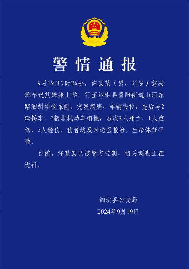 9 月 19 一天早晨,江苏省宿迁泗洪县泗州学校门口发生。多车碰撞事故,许多人被撞倒在地。泗洪县公安局通报称,驾驶员在驾驶过程中突发疾病导致车辆失控,事故造成 2 死 4 伤。