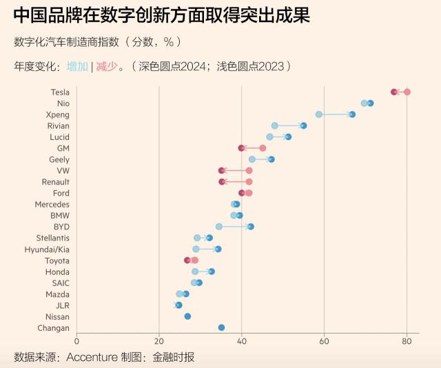 咨询公司 Gartner 根据最新发布的汽车集团数字化表现排名,只有福特、通用、宝马三家传统汽车厂商进入前十,其他则是中国的蔚来、小鹏、比亚迪、特斯拉。Rivian 和 Lucid 等待美国创业公司的主导。