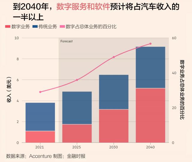 据埃森哲统计,数字服务仅占全球汽车制造商收入的约 3 亿美金,即 3% 上下。但是,咨询公司估计, 2040 这个数字将在2008年增加到 3.5 近1亿美元,占汽车工业收入的近 40%。