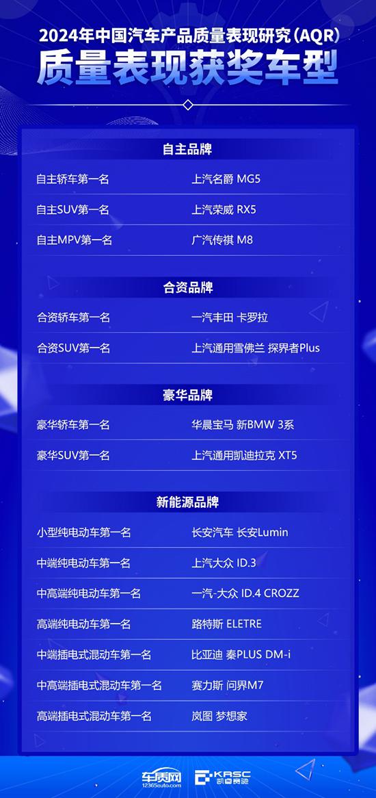 根据《2024 年中国汽车产品质量表现研究(AQR)》因此,主办方还公布了全车各目标市场的最佳品质性能和品质感受。在质量问题数量和客户抱怨度的综合得分上,中国汽车产品质量表现奖得奖车型领先于目标市场。在细分市场上,中国汽车产品质量感受奖得奖车型的客户体验表现最好,根据实际使用体验满足用户对重点汽车的需求。
