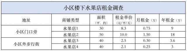 以我调查的四家水果店为例。 1 的月房租 7500 元 / 月,水果店 2 房租是 1.5 万 / 月份,面积差不多,租金差距有差别。 2 倍