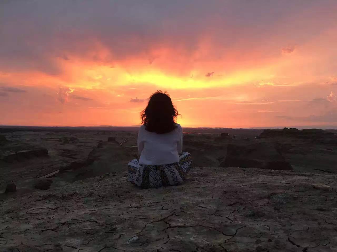 我一个人去新疆的时候,坐了很久的公交车去克拉玛依的魔鬼城看日落。那时候天已经太晚了,夕阳几分钟就会落下,所以下车后一路跑来跑去。魔鬼城是风蚀地貌。那些山被风吹得很奇怪。你越往里跑,就越可怕。当时我身边好像没人,就自己跑到了最高的山上。
