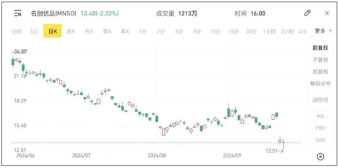 截至北京时间9月25日,名创优品美股报收13.40美元,为近期的最低水平。