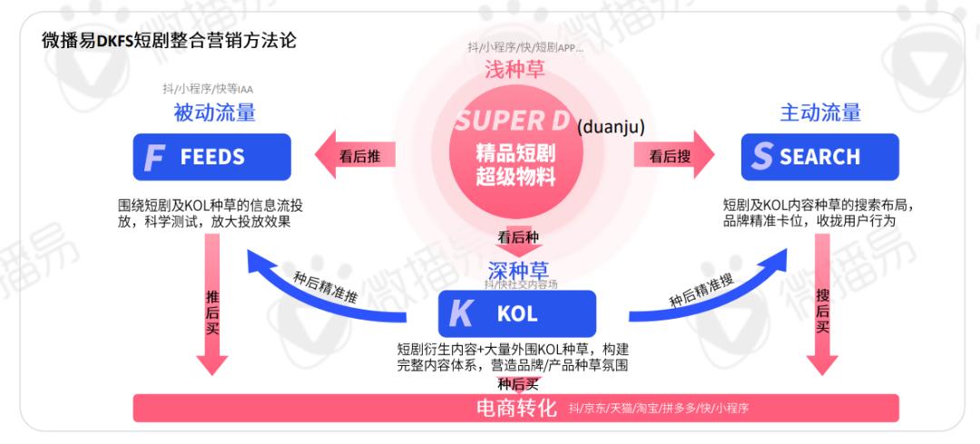 在此洞察下,微播易创新提出“DKFS”短剧整合营销方法论:“D”即SUPER D精品短剧,K即KOL达人种草,“F”即FEEDS流量投放,“S”即SEARCH搜索布局。以D+K全网内容覆盖,F+S全网流量平台闭环击破,盘活品牌主被动用户,催化从兴趣到种草到转化的生意闭环。