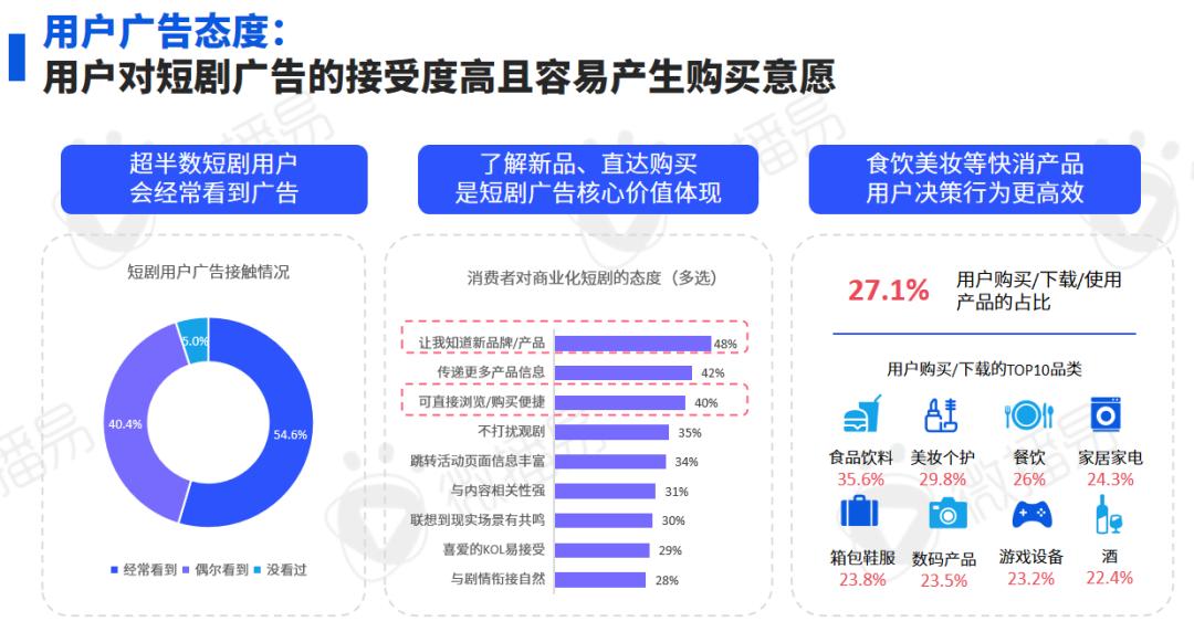 搞笑元素和爱情甜宠题材最能吸引用户的注意,而优质内容的背后是更高价值的八大人群,他们对短剧内嵌广告持开放态度,场景化的内容有效地激发他们的购买欲望,吸引了众多品牌的营销入局。