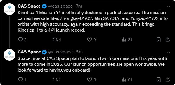 火箭队将配备中科卫星。 01 星、02 星星,吉林一号 SAR01A 星星,云遥一号 21 星、22 星等 5 一颗卫星顺利进入预定轨道,飞行试验任务圆满成功。