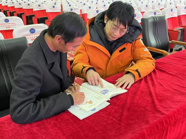钱艺涌与当地教师索朗平措讨论教案。