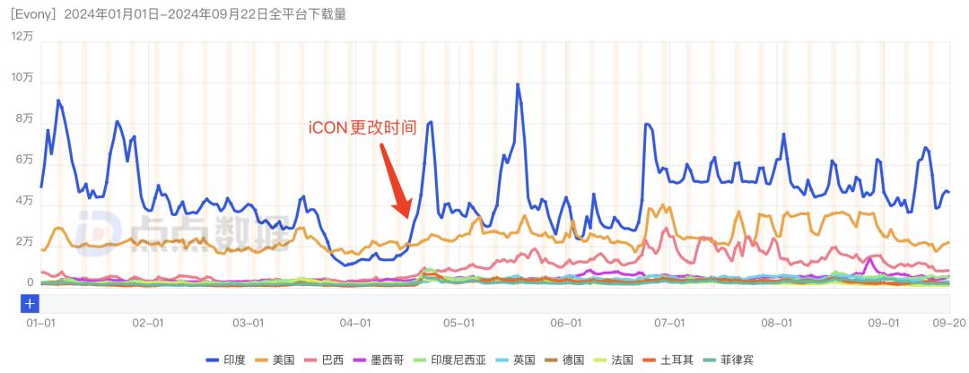 《Evony》换了游戏之后,印度、美国、巴西市场的下载量都在上升,而且印度市场一直保持着较高的水平。