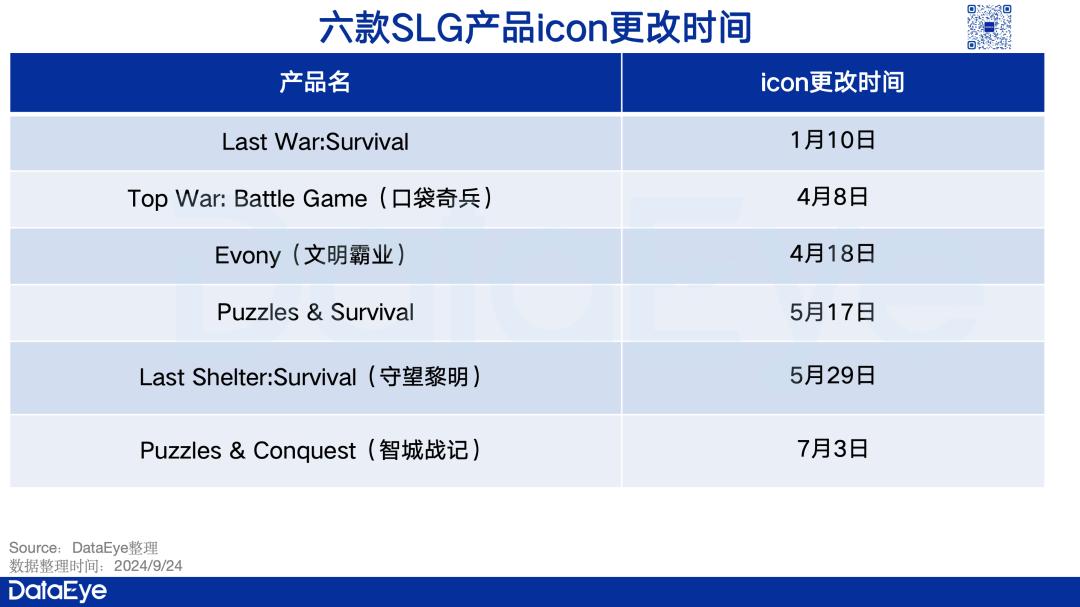 据DataEye研究所介绍,目前已有6款4XSLG产品将icon改为“加减乘除跑酷”。这些产品包括三七互娱,Top Games、王牌SLG商品,如江娱、龙创悦动等。