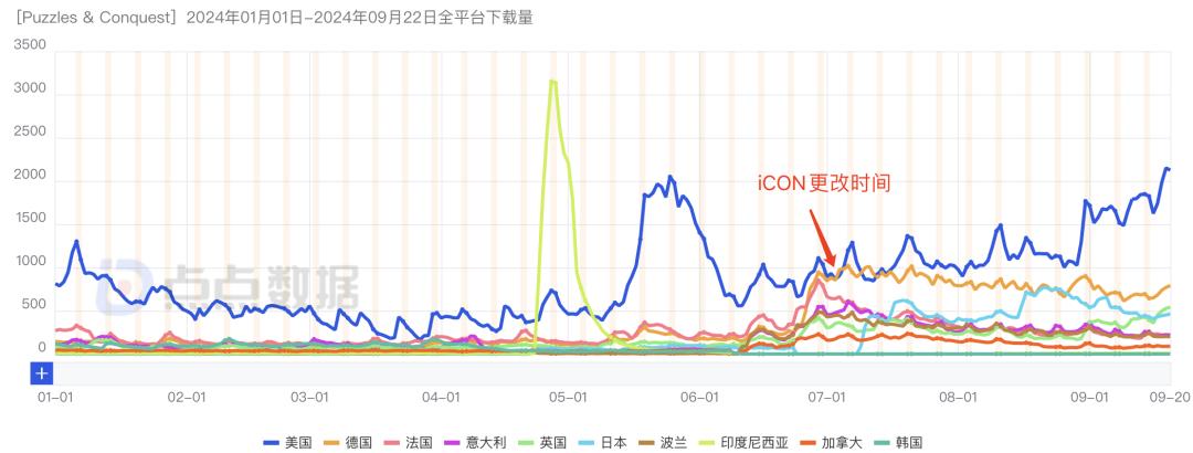 《Puzzles & Conquest》换了玩法之后,美德法意等市场的下载量有了一定程度的提高,而且美国市场的下载数据也在上升。
