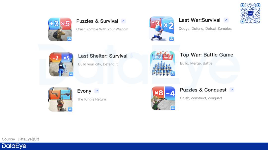 《Puzzles & Survival》、《守望黎明》、《智城战记》:商品以“打丧尸”为核心,与“加减乘除冲关跑酷”材料相匹配。