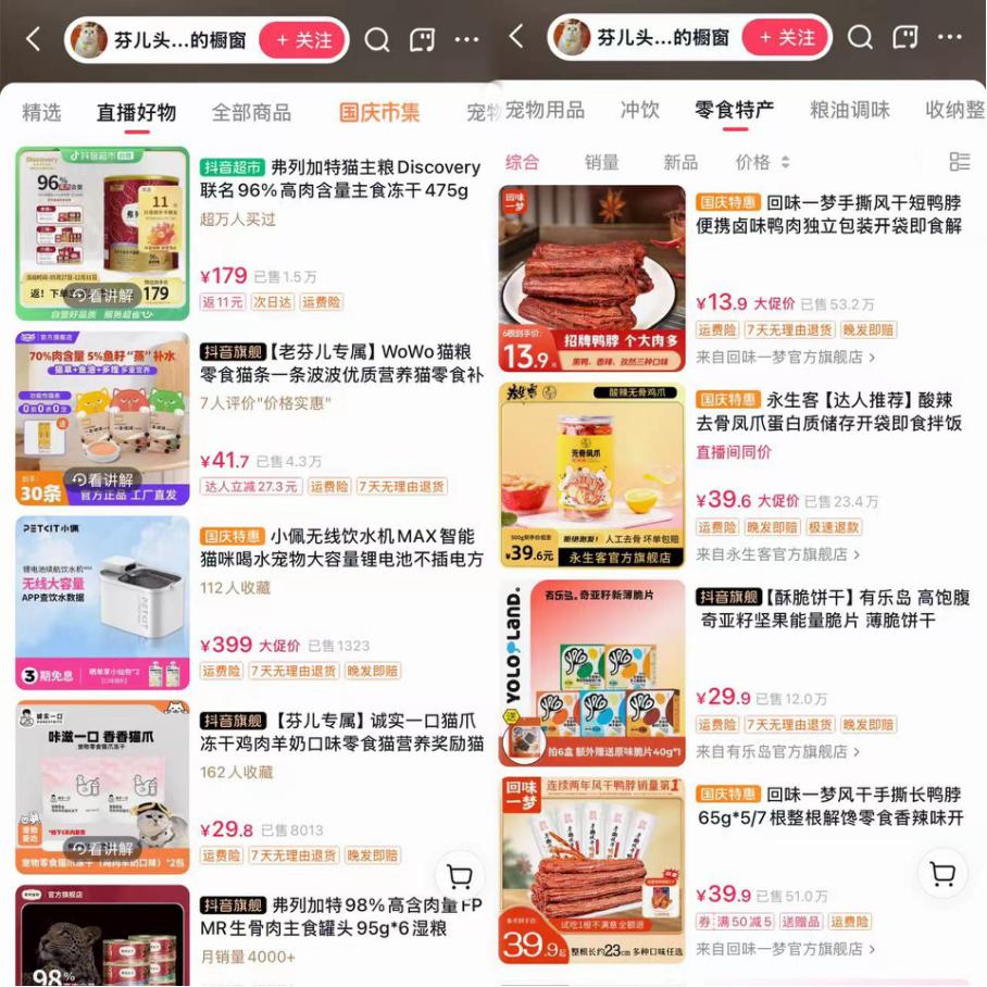 现在,@嘻哈不拆 每天都会开直播间,打造自己的品牌。产品主要是宠物零食和宠物保健食品。虽然个人IP可以成功塑造成商品,但还是有很大的局限性,针对的用户群体也比较集中。同时,宠物产品的回购周期较长,宠物博主的粉丝和商业增长仍有较低的天花板。