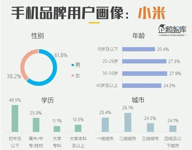 小米曾经是人们心目中的纯直男品牌,女性用户比例极低。现在,情况似乎发生了很大的变化。根据企鹅智库的数据,小米手机的女性用户比例只有38.2%,是所有主流品牌中最低的。