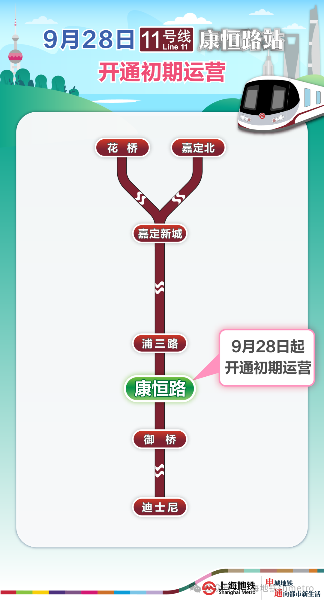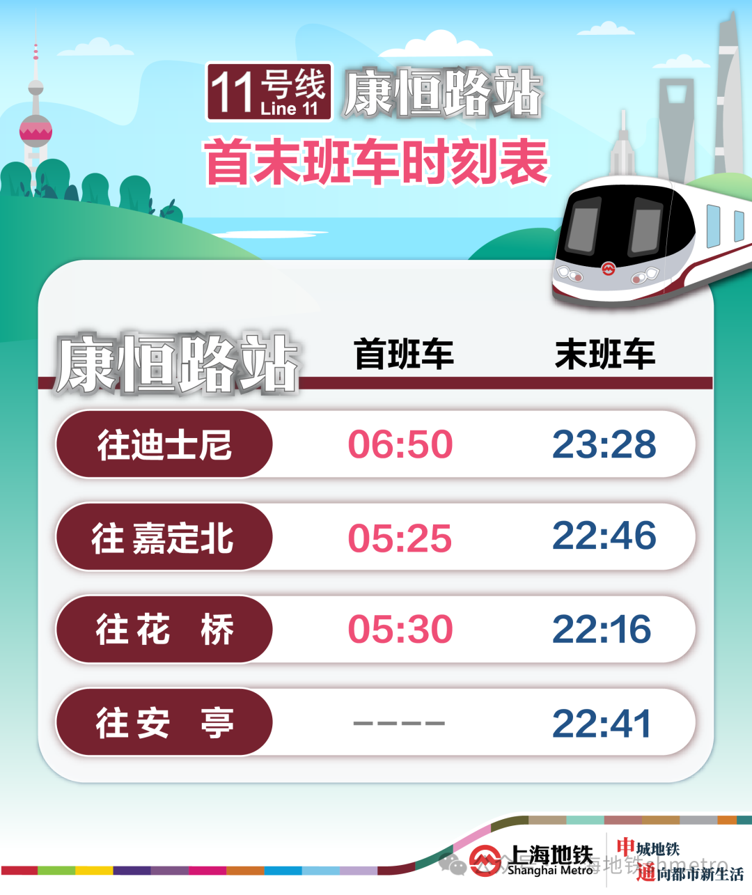 11号线康恒路站开通后,向迪士尼首班车时间06:50、末班车时间23:28;嘉定北首班车时间05:25、末班车时间22:46;花桥首班车时间通常为05:30、末班车时间22:前往安亭的末班车时间为22:41。乘客列车间隔与现有营销方案一致,本站工作日早晚高峰期平均2分30秒~3分45秒,工作日平峰6分钟;节假日高峰期(7分45秒;:00~20:平均5分钟;其它时间5分钟;~8分钟。