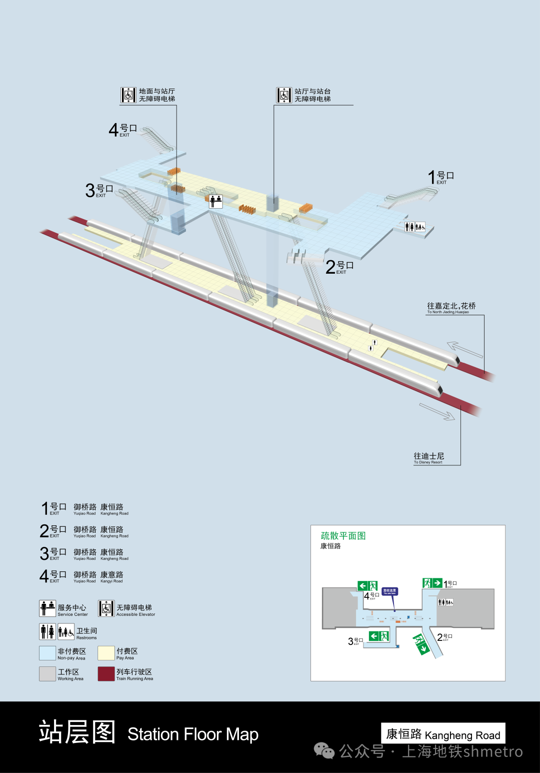 康恒路站有四个出入口和出入口。除了正常的出入口和出入口,它们都与道路办公楼的地块连接起来。上海地铁充分考虑了地块进出口的建设需求,积极推进地下联通通道与车站建设同步实施。最后,四个出入口和出入口可以通过建筑通道直接进入道路建筑或公园区域(2号口是下沉广场),为周边市民和乘客的出行提供了便利。