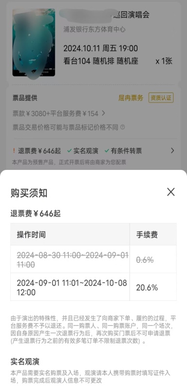 以“张某某巡回演唱会”为例,上海官方营销渠道退票手续费为0.6%和20.6%。