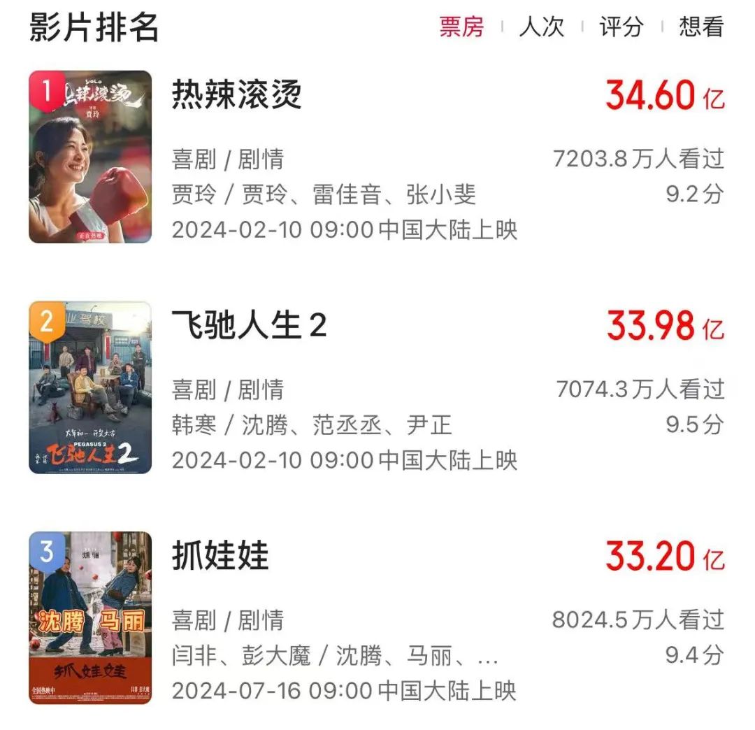纵观今年票房榜的冠军和亚军,都有很强的导演个人IP特色。贾玲、韩寒、闫非和彭大魔在《热辣》、《飞天人生2》和《抓娃娃》背后。这样的头部导演,才是真正的话语权所有者。