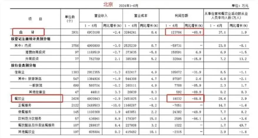 根据北京统计局的官方数据,2024年1-6月,北京限额以上餐饮企业利润总额为1.8亿元,同比下降88.8%,利润率低至0.37%。据了解,去年同期的数据约为16亿元。