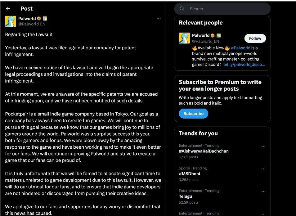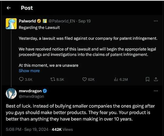同一天,Pocket Pair 在X平台的官方账号中做出回应,称未收到诉状,不了解被指控专利侵权的具体内容,后续将按照法律程序采取相应的应对策略。