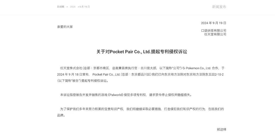 此前,任天堂官网在9月19日发布公告,称任天堂将与宝可梦公司一起对Pocket进行公告。 Pair (幻兽帕鲁的开发公司)提到了与专利侵权有关的诉讼,要求后者停止侵权并赔偿损失。