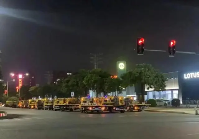 图为广东永奥投资集团数十辆店内新车被银行连夜用拖车拉走。