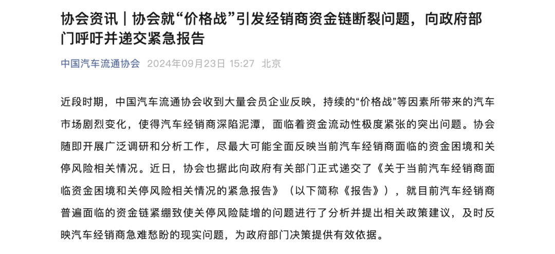 9月23日,中国汽车流通协会官方微信发布消息称,近期,协会收到大量会员企业反映的汽车市场因持续的“价格战”等因素而发生的剧烈变化,使得汽车经销商陷入泥潭,现金流赤字运营和资金短缺风险普遍增加,难以摆脱生存困境。