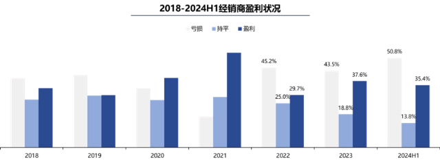 根据中国汽车流通协会发布的2024年上半年全国汽车经销商生存状况调查,2024年上半年经销商亏损比例达到50.8%,利润比例达到35.4%。