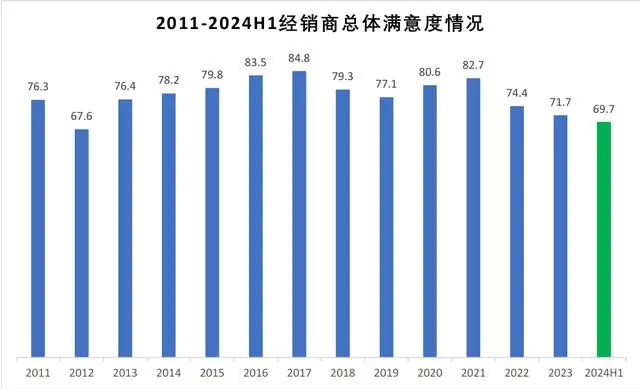 根据中国汽车流通协会发布的《2024年上半年全国汽车经销商生存状况调查报告》,上半年经销商整体满意度得分为69.7分。
