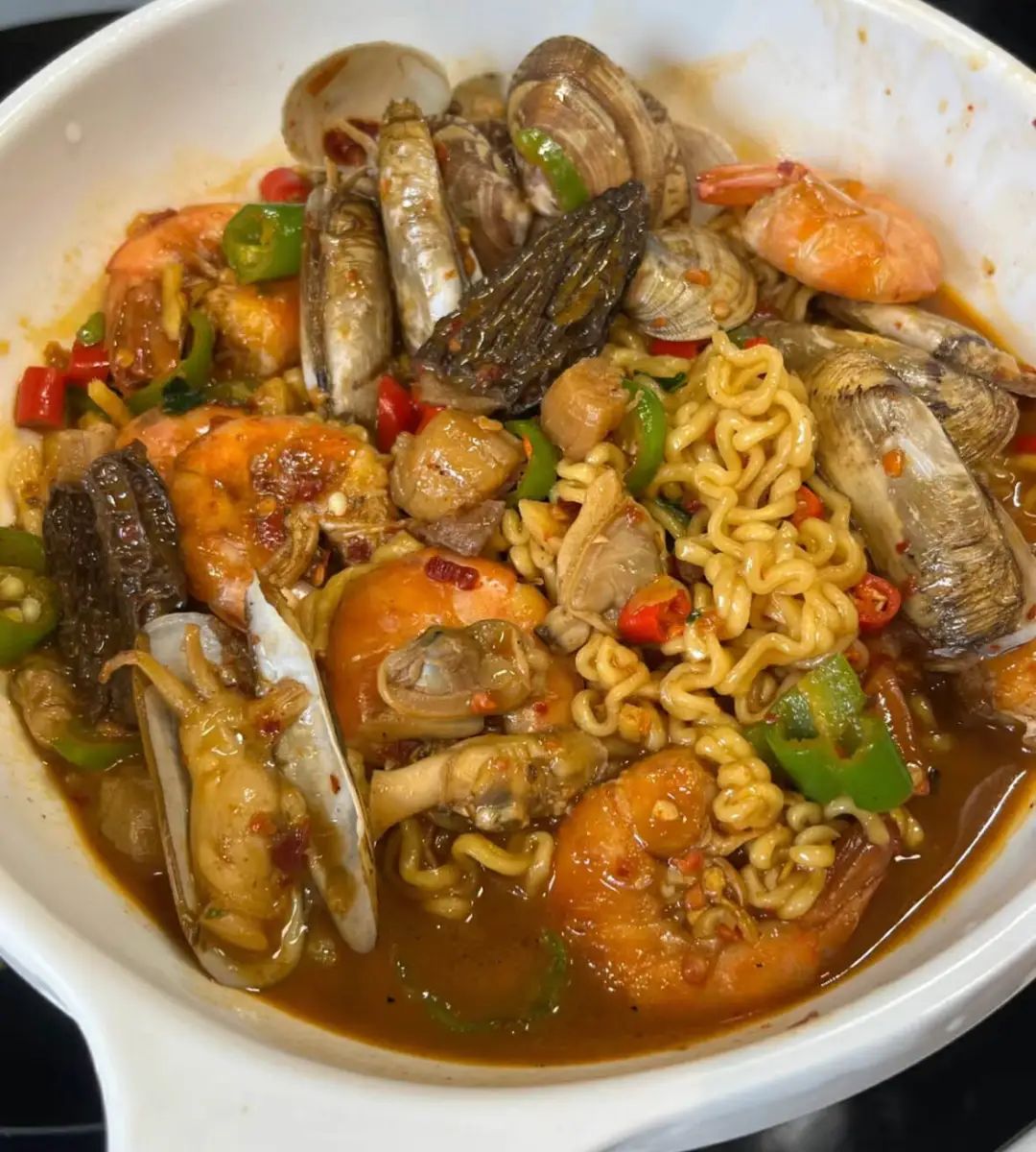 而且现在最富有的博主已经看不上牛肉了,在一袋5块的方便面里,先用佛跳墙挂一个汤,再用帝王蟹做一顿饭。几个零星的方便面在巨大的海鲜旁边变成了点缀。。
