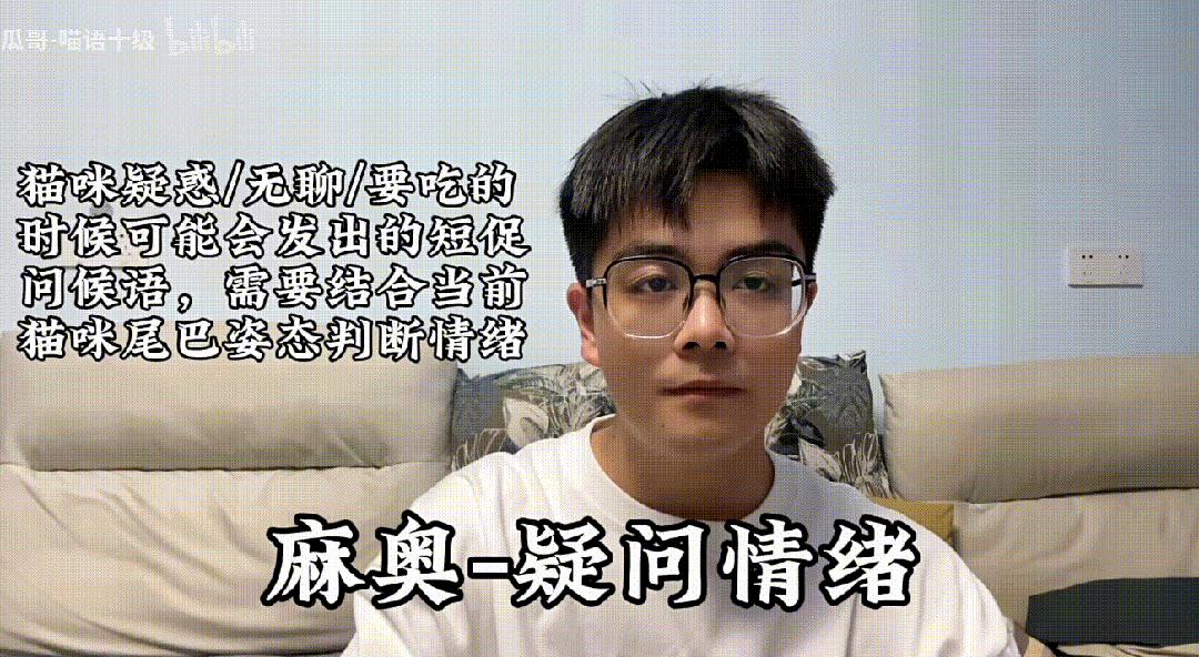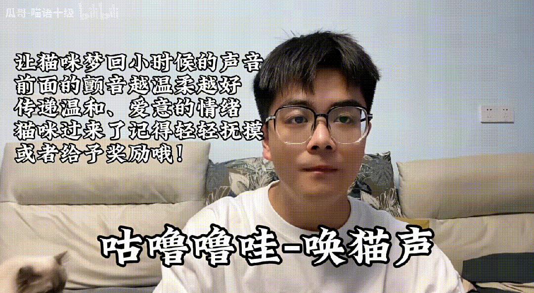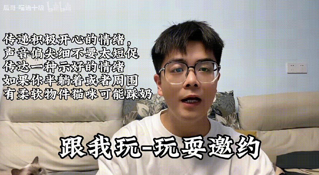 瓜哥视频教了五种最常用的猫语。比如邀请猫咪来玩的时候,只需要用尖锐短暂的语气“和我一起玩”普通话,让声音介于“呜呜”和“和我一起玩”之间。