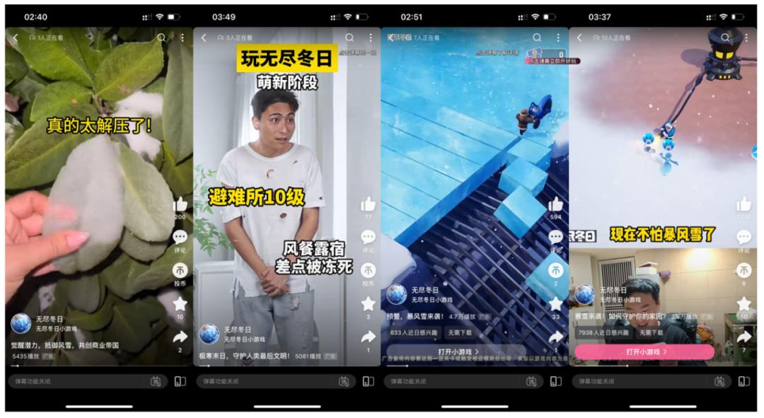 一点点互动的《无尽的冬天》给了我们一个很好的“当前版本答案”——最后一个冰雪主题,衍生到生存、副玩法、原创素材,让素材摆脱SLG模式,内容多样轻量化,让素材投放形成鲜明的多样化,覆盖足够多的泛用户。