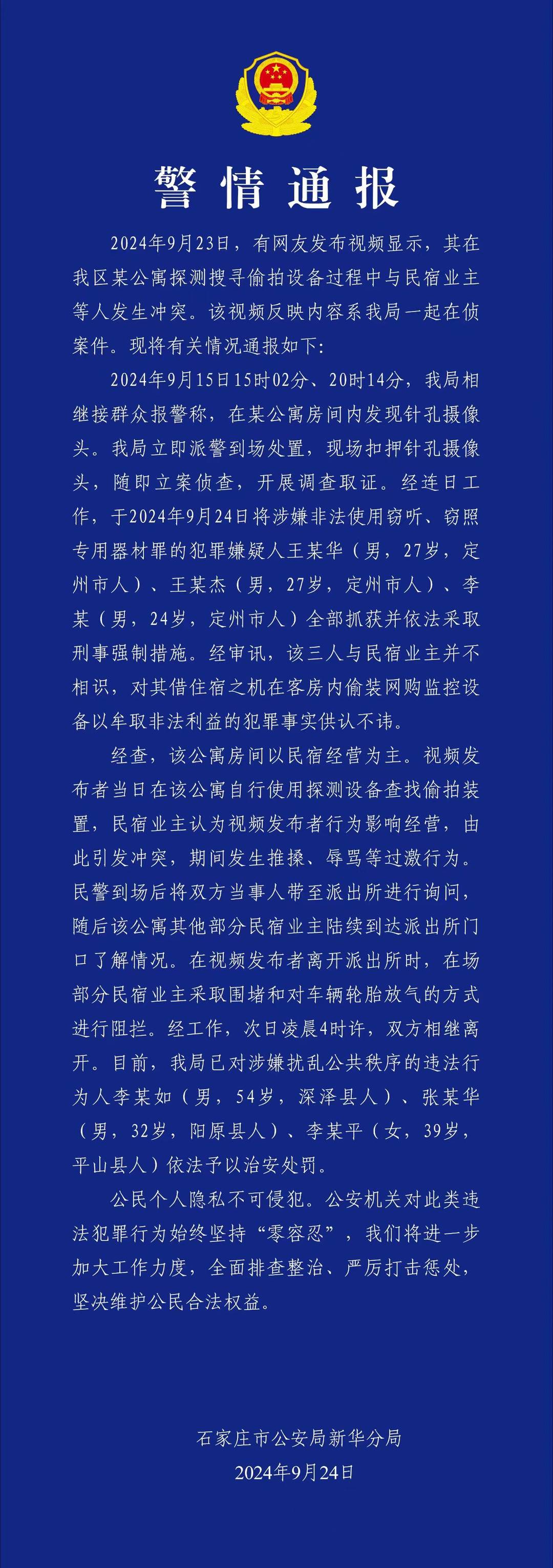 当晚,石家庄市公安局新华分局发布通知,逮捕了王某华、王某杰、李某某所有涉嫌非法使用窃听、窃取专用设备的犯罪嫌疑人,并依法采取刑事强制措施;李某如、张某华、李某平已依法处罚涉嫌扰乱公共秩序的违法行为人。