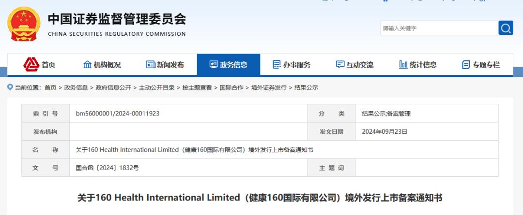 九月二十三日,中国证监会国际合作司发布了160 Health International Limited(健康160国际有限公司)海外发布上市备案通知书,计划在香港联合交易所发行海外上市普通股不超过61452500股上市。
