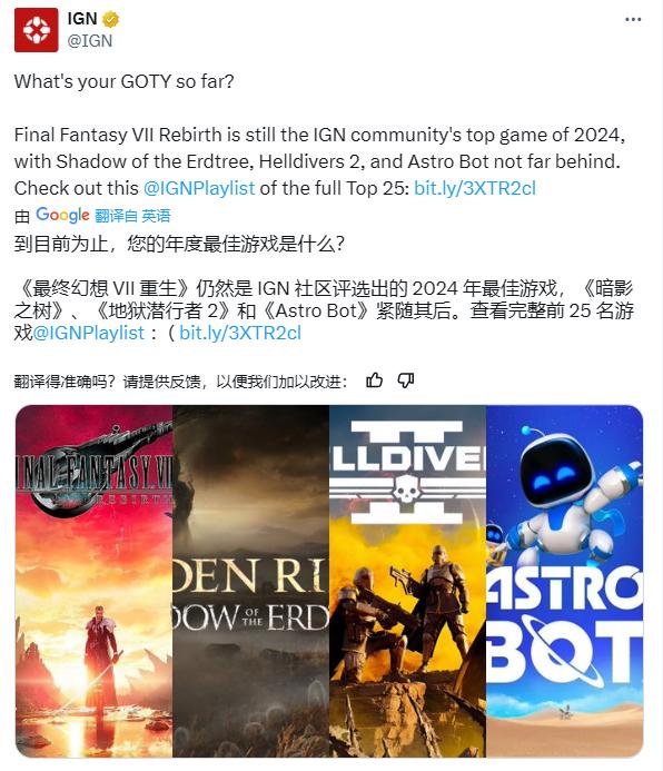 近日,海外著名游戏媒体IGN举行了2024年度玩家投票。