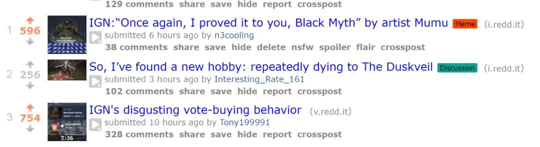 一个国内画家制作的讽刺IGN梗图,更是冲到了reddit黑神话板块的第一位。