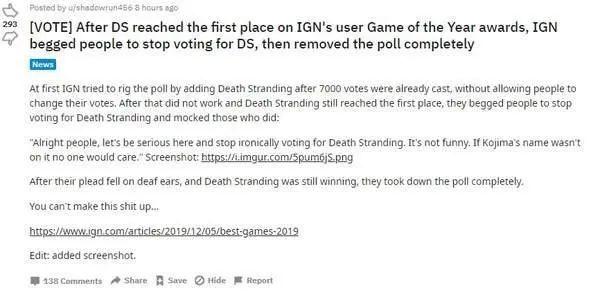 谁知道,IGN竟然劝说玩家不要为《死亡搁浅》投票。由于他们发现了大量非正常的投票行为,他们宣布该玩家的投票无效。