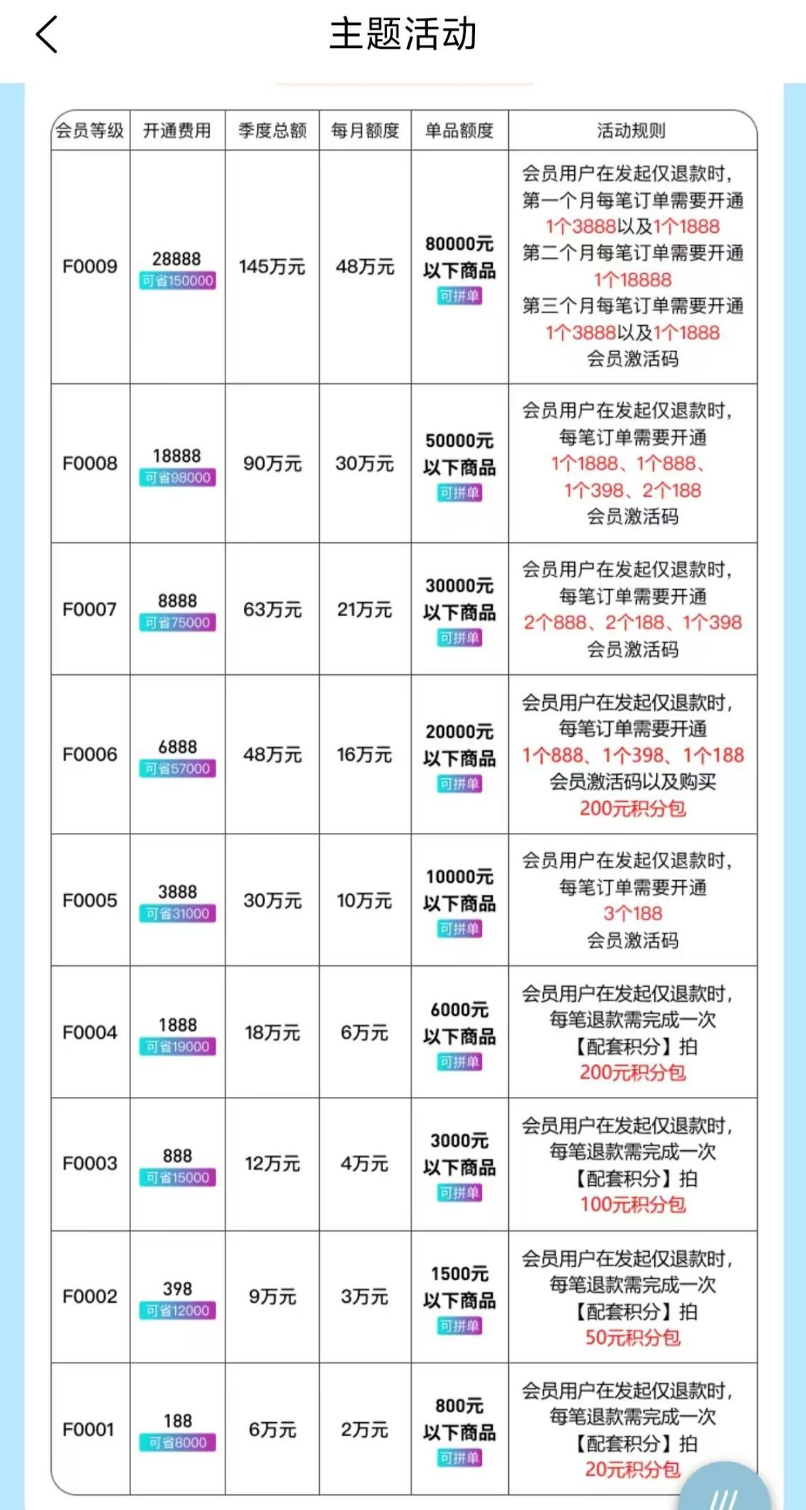 京淘淘的会员费大概有9个等级,从188元到28888元不等。每个等级的会员费只会给不同的退款名额,可以买的东西也不一样。正式申请退款时,除了原购买的会员,还要购买“配套会员”才能退款。配套会员只是一些激活码,不能自己使用。