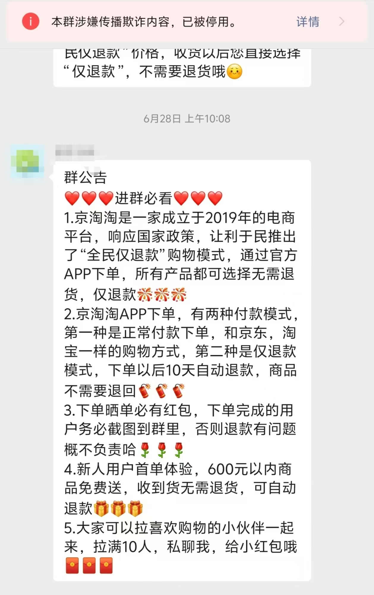 我有一种预感,退款应该有问题。从那以后,我再也没有买过任何商品。很快,我的京淘淘微信群也被停用,显示“涉嫌传播欺诈内容”,绝对不是群主解散群聊。