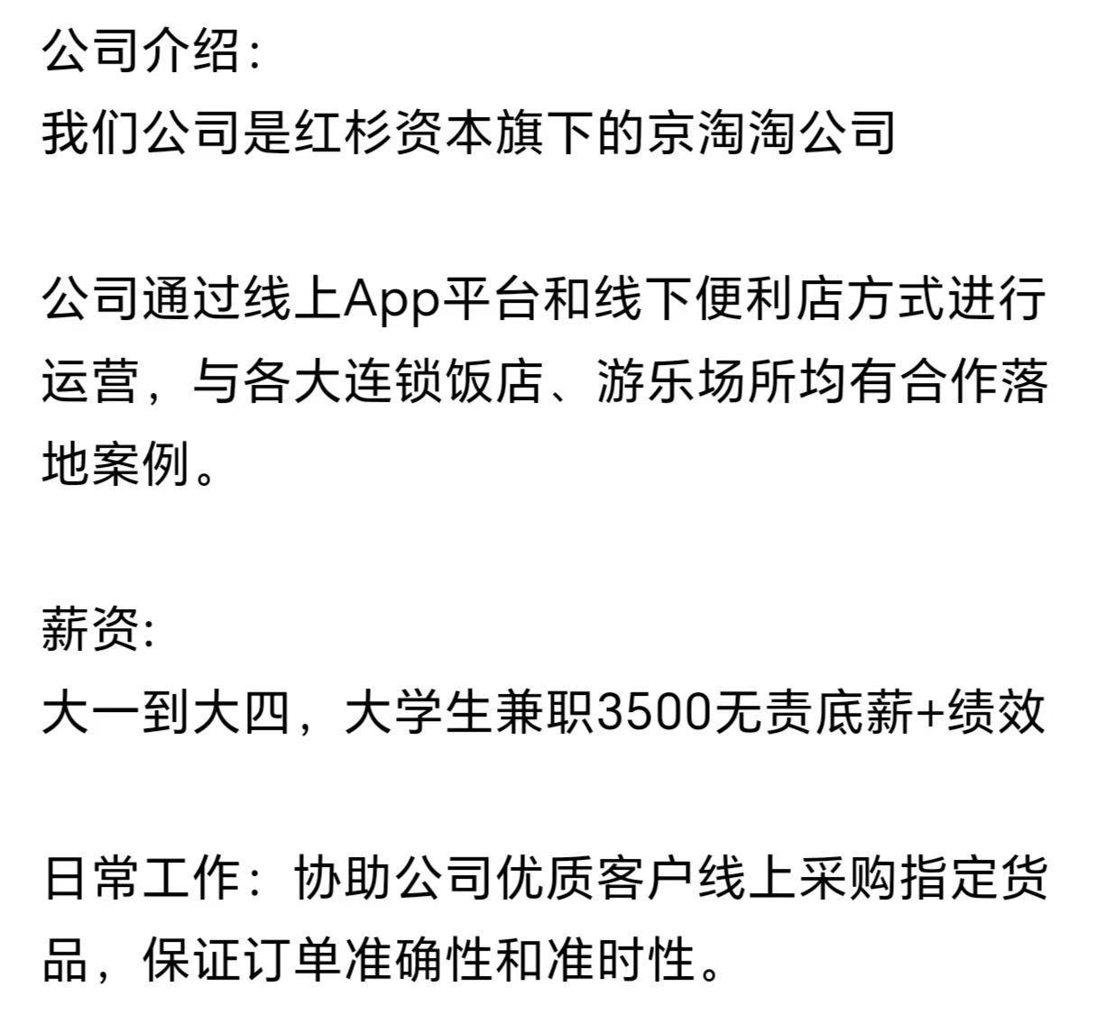 我还看到一个关于北京淘淘招聘学生兼职的信息。我不太明白工作内容,显示“帮助公司高端客户在线购买指定商品,保证订单的准确性和准时性”。然而,结合我这些奇怪的购买手机的经验,我似乎明白了这句话的意思。