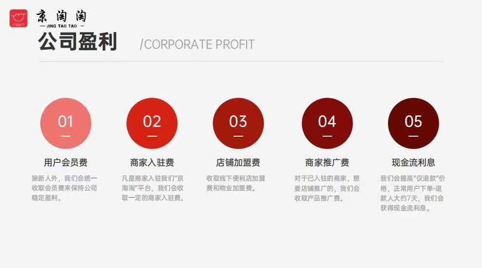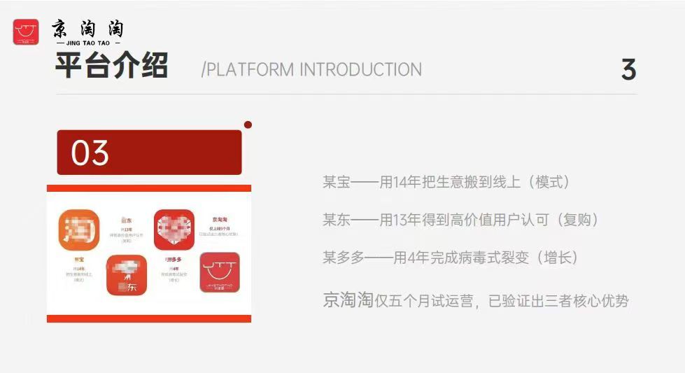 这些图片很有噱头。一张图片暗示,淘宝、JD.COM、拼多多只试了五个月,已经验证了其核心优势。其他图片解释说,淘宝的收入主要取决于客户会员费、商家入场费、店铺加盟费、商家推广费和现金流利息。