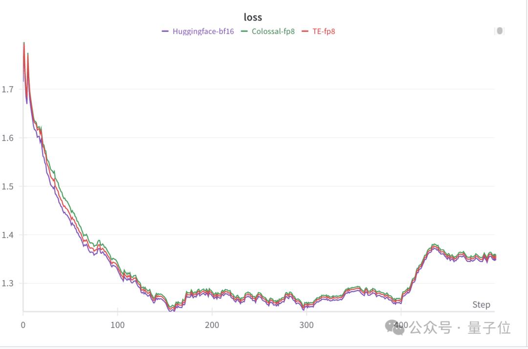 与此同时进行了收敛测试,可以看到FP8混合精度训练的loss曲线与bf16基本一致,如图4所示: