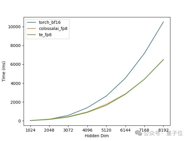 通过检测单卡H100中矩阵乘法,可以看出矩阵的维度越大,FP8的加速效果就越明显,而且Colossal-AI的实现和Transformer 如图1所示,Engine的性能几乎相同。但是Transformer Engine需要复杂的AOT编译环境配置和较长的编译时间。
