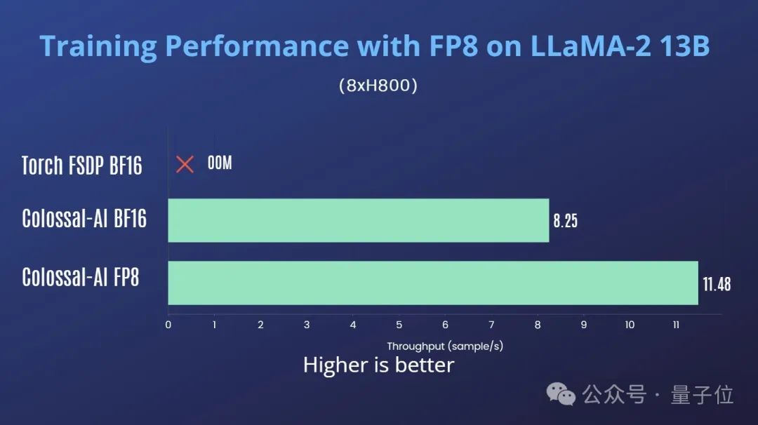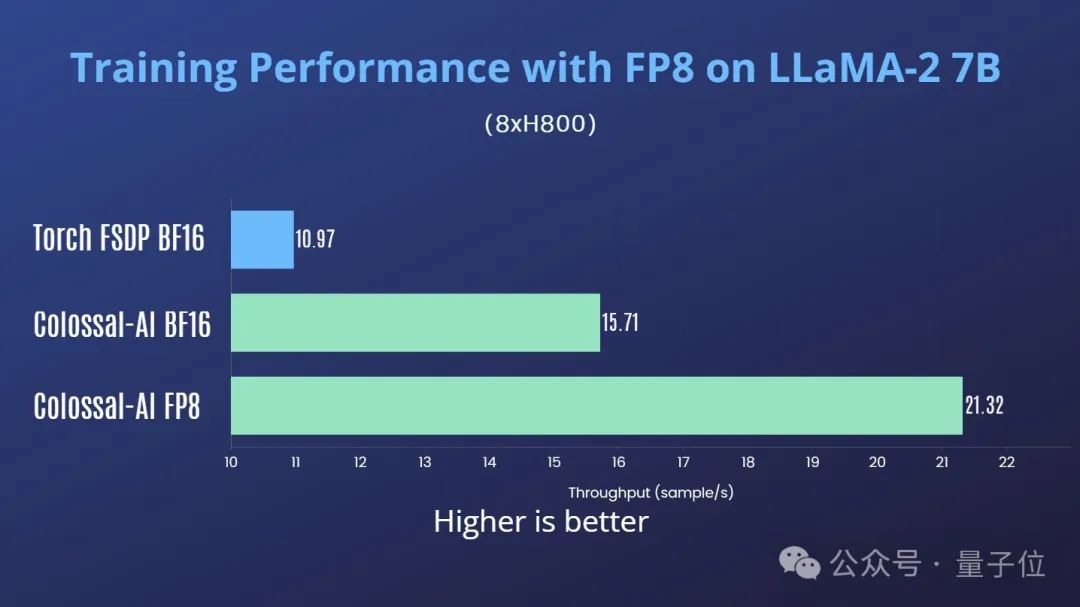 Colossal-在H800多卡并行训练场景中,AI还测试了性能。单机8卡H800训练LLaMA2-7B,Colossal-AI ColossalossFP8对比-AI 与Torch相比,BF16的吞吐量提高了35%。 FSDP 94%的BF16吞吐量增加。