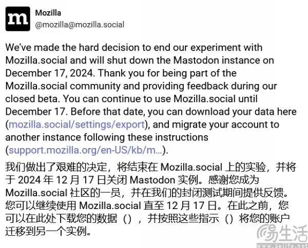 近日,运营火狐浏览器的Mozilla公司发布官方博客称,Mozilla将于2024年12月17日停止运营去中心化社交平台.social。实际上,Mozilla.social是一系列主要推动去中心化社会化的产品之一,它诞生于去年X平台在马斯克的“盲目指挥”下大量客户逃离时,吸引前者客户。