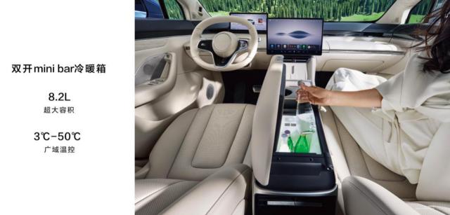 可选配前排中央扶手箱。 8.2L 双开 mini bar 冷暖箱,支持 3-50 温度控制范围广,让乘客享受冷热饮品,以及中控储物格、肩枕音箱等配置,感觉更加贴心。