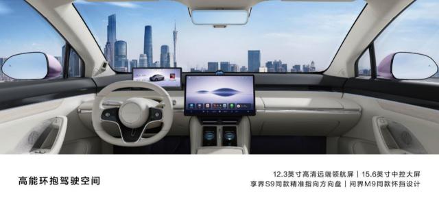 得益于车身比例的创新和车内布局的优化,智界 R7 舱内前后排都很接近 1 大米空间。车内前排营造出更具科技感的高能环绕驾驶空间。通过划分视线区域、显示区域和控制区域,结合尺寸优化的橄榄型方向盘,驾驶员可以获得更透明的视野和更自由的驾驶体验。中控岛配置全连接 2 个 50W 非常无线快充,3 个 66W 有线快充和双杯托,充电,收纳更快。