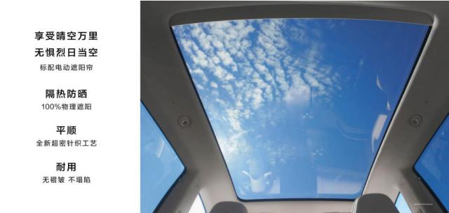 智界 R7 不仅有着 2.1m2 超大型全景天幕带来的透明空间体验,配有100%的电动遮阳帘。 物理遮光防晒,关闭时不影响头部空间,长时间使用无褶皱,不塌陷。整车也通过超车。 100 项风噪声控制技术,创造更安静的乘坐体验。