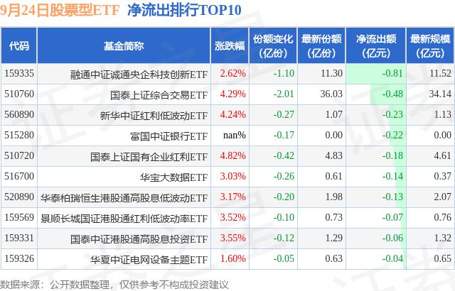 当天有 33 只股票型 ETF 资金净流出,其中净流出排名第一的是融合中证诚通央企科技创新 ETF(159335),份额下降 1.1 一亿份,净流出额为 8105.05 万元。